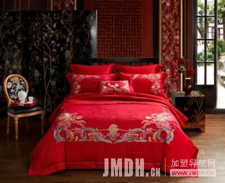喜鹊在中国传统文化中有吉祥和爱情的象征,与郁金香、玫瑰、金银花相融合,花团锦簇,繁华似锦,寓意新人婚后生活前程似锦、兴旺发达的欣欣向荣景象;只为见证“愿得一人心,白首不相离”的忠贞爱情;中式庭院中的两个案板元素象征“举案齐眉”;桂圆红枣莲子花生在被角处的精致绣花,增添特有的喜气,传统的风雅绽放出别样的韵致,为中式婚房增添别样热闹的喜气氛围。