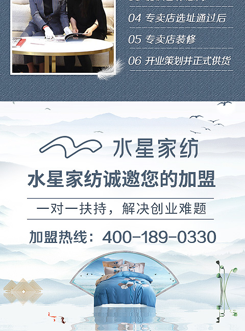 现在加盟水星家纺享9大优惠加盟支持!免费获取详细加盟优惠政策、加盟条件、产品图册、投资详情资料,敬请留言或电话垂询。